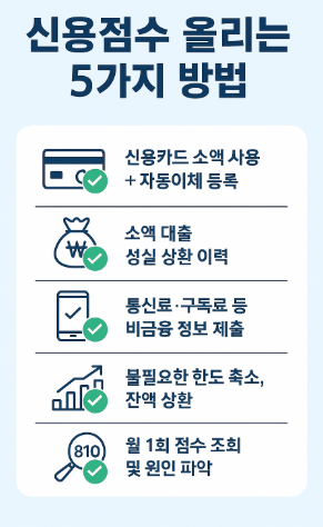- 카드론, 현금서비스는 오히려 점수 하락 요소 → 가급적 피해야 합니다.